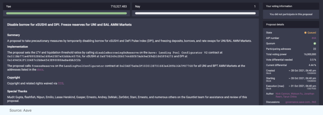 近期就有一个例子能说明这一情况:Aave 是一个去中心化的货币市场协议,其网络参与者上周在该协议中使用 xSushi 作为抵押物时发现,该协议依然存在潜在漏洞,原因是预言机出现了错误报价(CREAM Finance 因黑客攻击损失了 1.3 亿美元)。Gauntlet 对风险进行了评估模拟,发现在目前的市场条件下,潜在攻击者还无法操纵货币价格。不过,为了预防这种情况的发生,Gauntlet 在 Aave 治理中提出了一项建议,他建议禁止某些类型的借款以降低风险,这一建议也得到了参与者的一致认可。(Aave 的 DAO 是 Gauntlet 的一个客户)